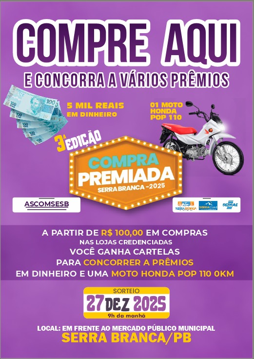 Comércio de Serra Branca lança 3ª edição do “Compra Premiada” com sorteios em dinheiro e moto zero km