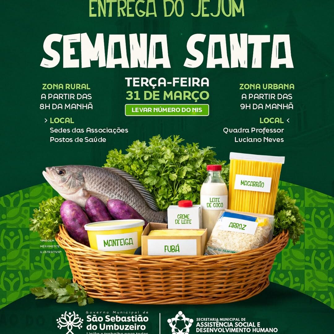 A Prefeitura de São Sebastião do Umbuzeiro, por meio da Secretaria de Assistência Social e Desenvolvimento Humano, realiza nesta terça-feira (31) a tradicional entrega do jejum da Semana Santa para as famílias beneficiárias dos programas sociais do município. A ação, que já faz parte do calendário tradicional da cidade, tem…