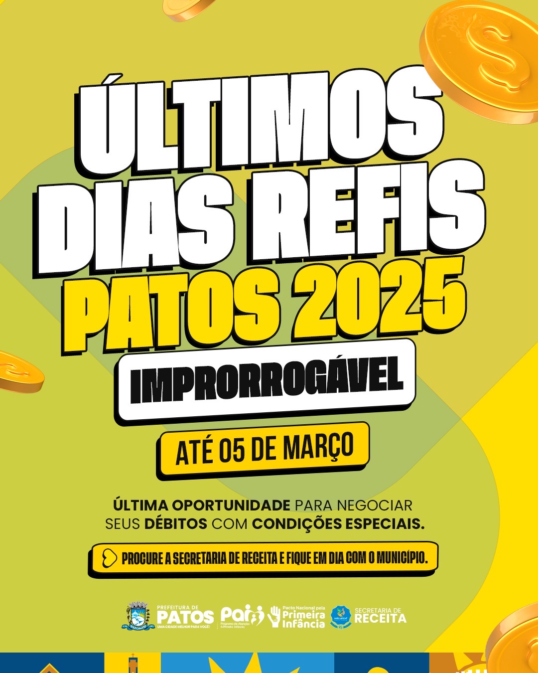 A Prefeitura de Patos, por meio da Secretaria de Receita, informa que esta é a semana decisiva para o encerramento do REFIS Patos. O prazo para adesão termina nesta quinta-feira, dia 5 de março, e não haverá prorrogação. De acordo com o secretário de Receita, Marcos Honorio, a oportunidade é…