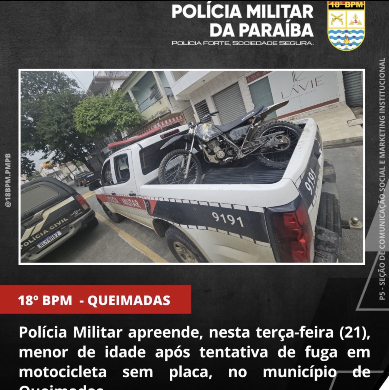 Menor é apreendido após fuga com motocicleta sem placa em Queimadas