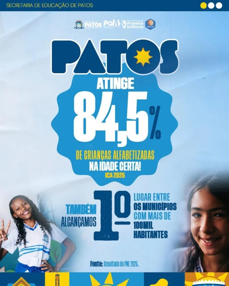 Patos bate metas nacionais e estaduais ao atingir 84,5% no Índice de Crianças Alfabetizadas na idade certa O município de Patos alcançou 84,5% de crianças alfabetizadas na idade certa em 2026, consolidando um resultado de destaque no cenário educacional. Os dados foram divulgados nesta terça-feira, 31 de março. O desempenho…