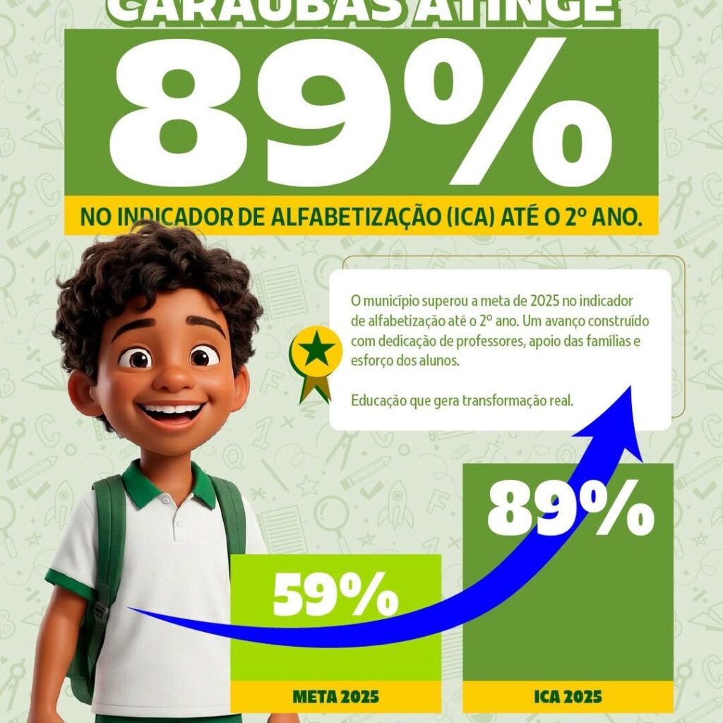 O município de Caraúbas atingiu um marco expressivo na área da educação ao registrar 89% de crianças alfabetizadas até o 2º ano do ensino fundamental, conforme o Indicador de Criança Alfabetizada (ICA). O resultado supera com folga a meta estipulada de 59% para o ano de 2025.