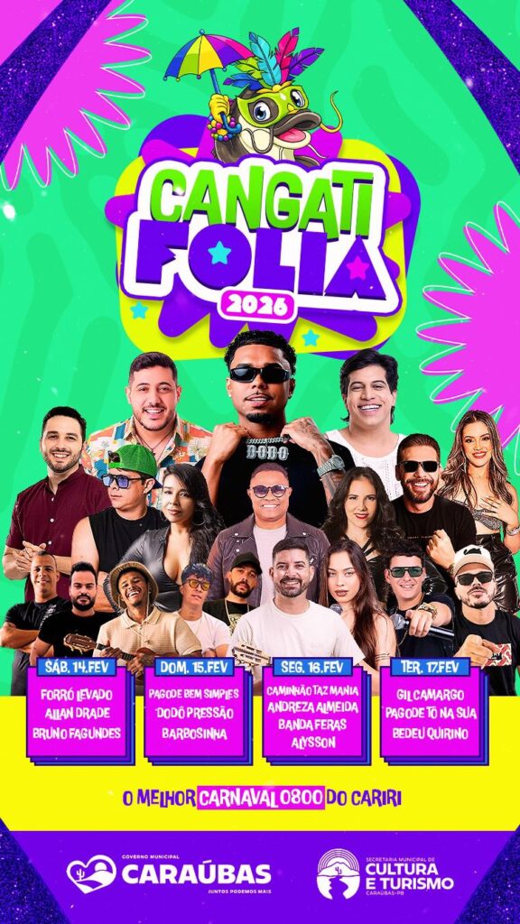 A Prefeitura de Caraúbas, por meio da gestão do prefeito Nerivan Gari, divulgou oficialmente a programação do Cangati Folia 2026, o tradicional carnaval 0800 do município, que será realizado entre os dias 14 e 17 de fevereiro.