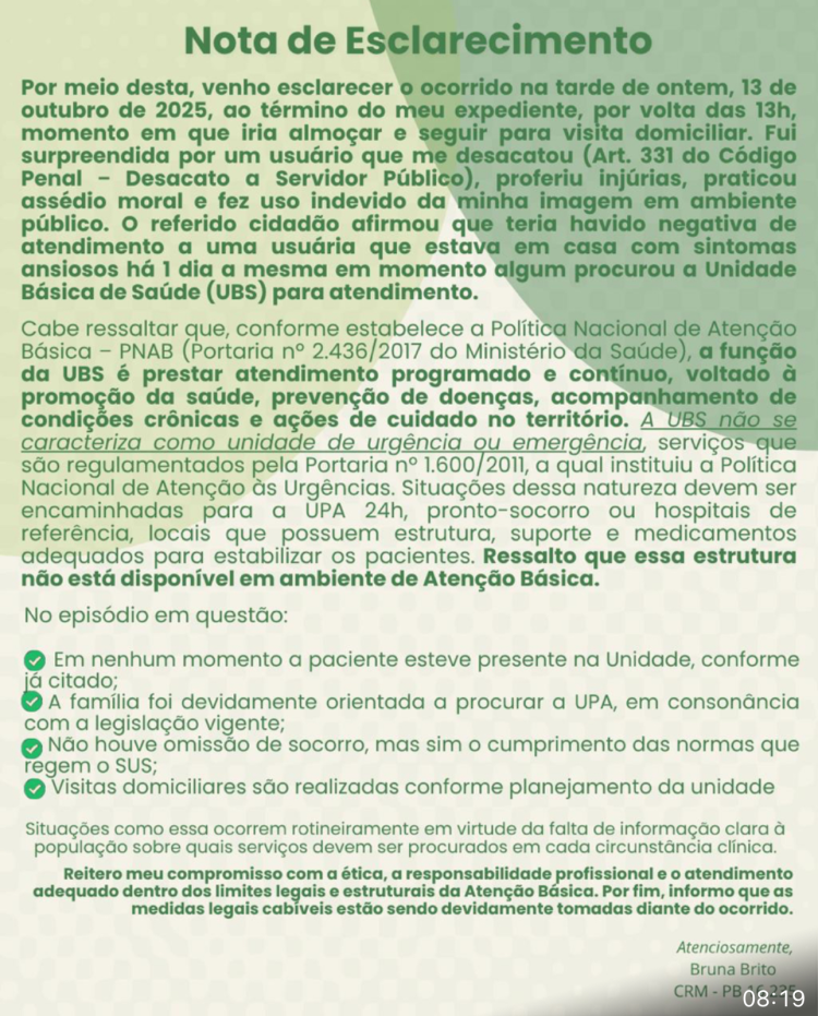 “Por meio desta, venho esclarecer o ocorrido na tarde de ontem, 13 de outubro de 2025, ao término do meu expediente, por volta das 13h, momento em que iria almoçar e seguir para visita domiciliar. Fui surpreendida por um usuário que me desacatou, proferiu injúrias, praticou assédio moral e fez uso indevido da minha imagem em ambiente público.