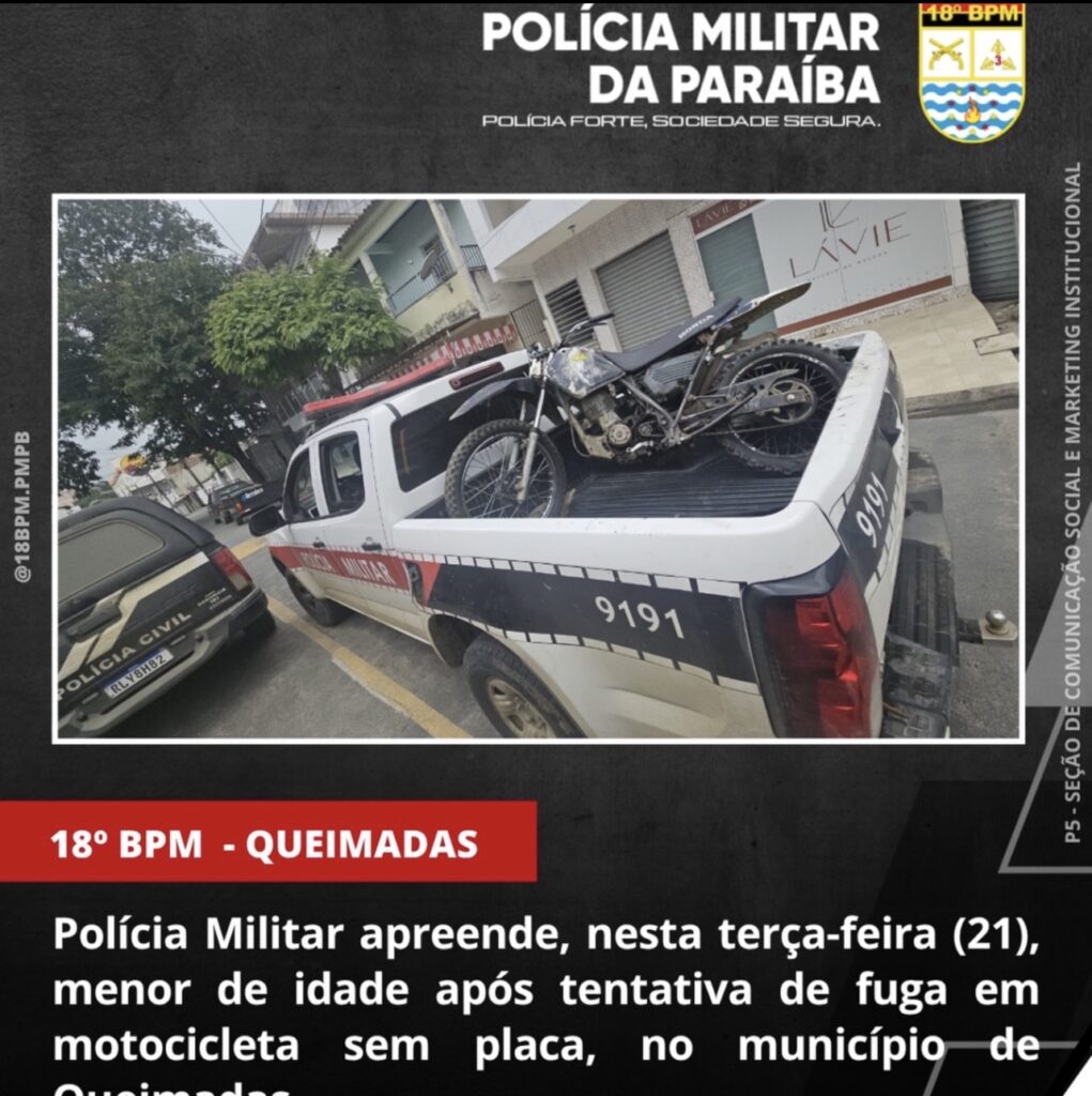 O adolescente foi apreendido e encaminhado, junto com o veículo, para a Delegacia de Polícia Civil de Queimadas, onde foram adotadas as medidas cabíveis.
