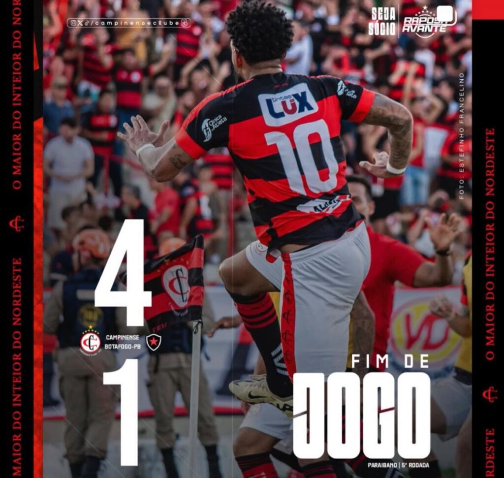 O Campinense foi soberano no Clássico da Emoção e venceu o Botafogo-PB por 4 a 1, na noite deste sábado (31), no Estádio Amigão, em Campina Grande, pela 5ª rodada do Campeonato Paraibano 2026.
