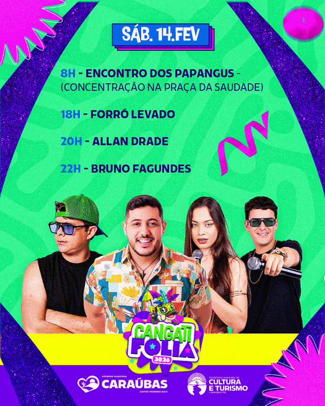 O prefeito de Caraúbas, Nerivan Gari, divulgou oficialmente a programação completa do Cangati Folia 2026, evento que já é considerado o “melhor Carnaval 0800 do Cariri”. A festa é promovida pela Prefeitura Municipal, por meio da Secretaria de Cultura e Turismo, e promete reunir grande público durante os dias de celebração.
