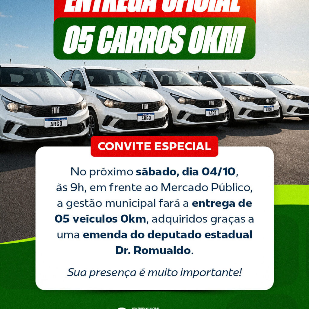 A Prefeitura Municipal de Caraúbas anunciou para este sábado (04/10) a entrega oficial de cinco veículos 0km, fruto de uma emenda do deputado estadual Dr. Romualdo. A solenidade acontecerá a partir das 9h, em frente ao Mercado Público, e contará com a presença do prefeito Nerivan Gari, autoridades locais e a população em geral.