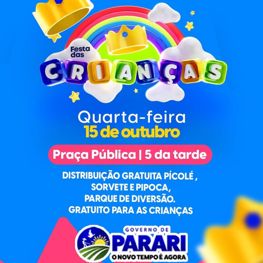 A Prefeitura Municipal de Parari, promoverá no dia 15 de outubro, a Festa das Crianças, que acontecerá na Praça Pública, a partir das 17h.