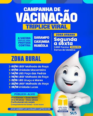 A Prefeitura Municipal de São João do Cariri, por meio da Secretaria de Saúde, deu início à Campanha de Vacinação Tríplice Viral, que protege contra sarampo, caxumba e rubéola. A ação contempla tanto a zona urbana quanto a zona rural do município, garantindo o acesso da população a essa importante medida de prevenção.