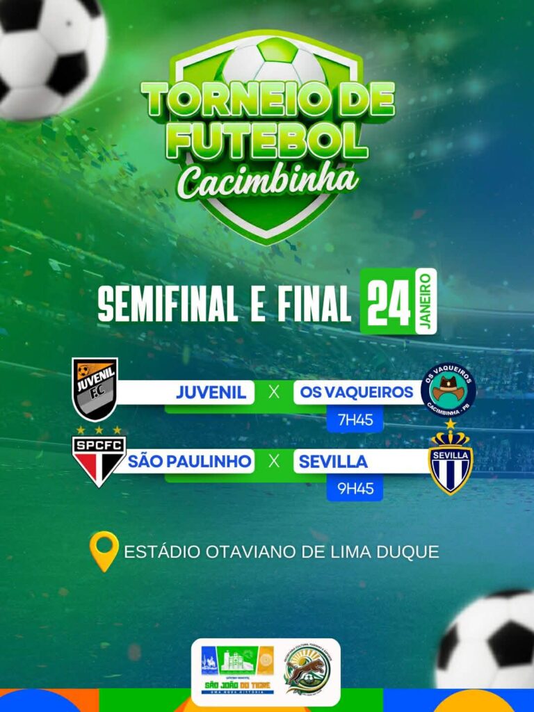 Em seguida, às 9h45, será disputada a segunda semifinal, reunindo os times do São Paulinho e do Sevilha. As partidas prometem fortes emoções para atletas e torcedores, que devem comparecer em grande número para prestigiar o futebol local.